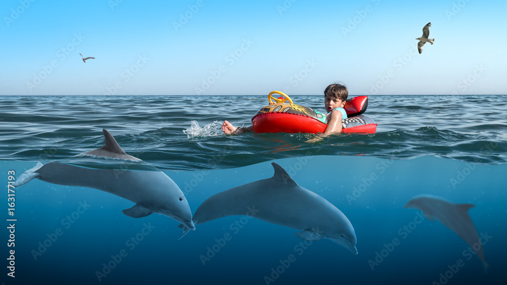 Ein Kind beobachtet Delfine von einem Gummiboot