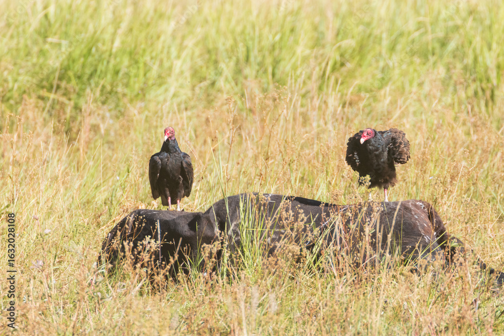 Turkey vultures (Cathartes aura) feed on a dead cow in a grassy field in Lassen County, California, showcasing scavenger behavior in the wild.
