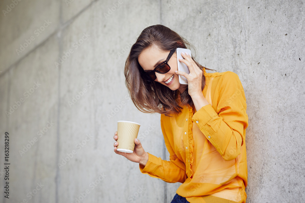 Beautiful young lady talking on phone and drinking coffee while outside in the city