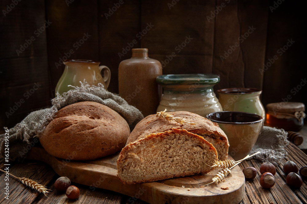 Homemade wheat bread and vintage ceramic kitchenware. Artistic Still Life in Vintage Style.