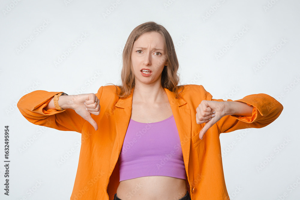 Portrait of disappointed young woman shows thumbs down, dislike, disapprove smth bad, negative opinion, posing on a white background, wearing an orange blazer