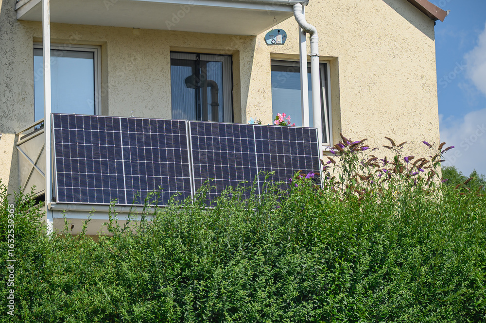 Small balcony solar power system mounted on residential apartment building, partially hidden by green bushes and blooming flowers, symbolizing sustainable energy solutions, eco-friendly urban living.