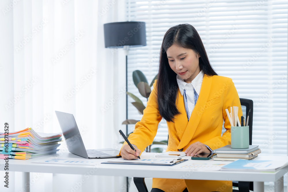 Focused Professional: A dedicated professional meticulously reviews and documents important paperwork, her attention laser-focused on the task at hand, desk setup, and the modern workplace.