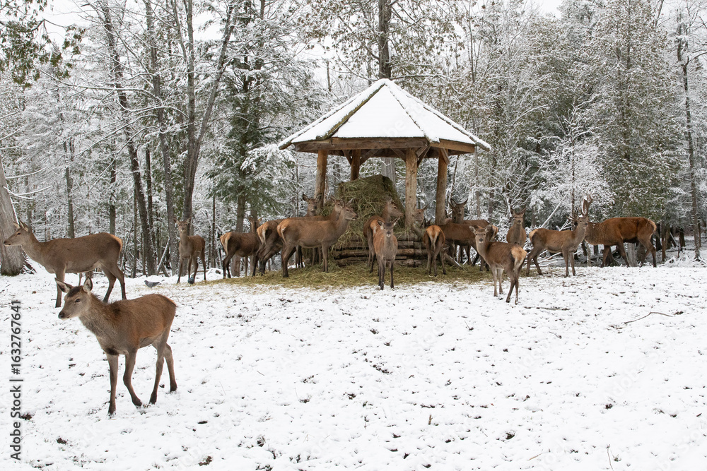 Red Deer Herd Feeding in Winter Forest, Cervus elaphus, Wildlife Photography