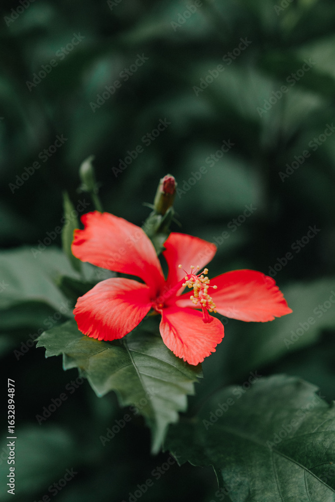 Close-up of a vibrant red hibiscus flower in Moorea, French Polynesia.