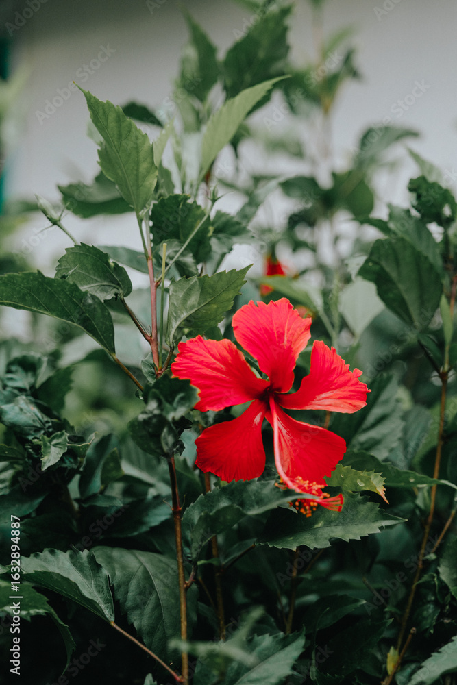 Close-up of a vibrant red hibiscus flower in Moorea, French Polynesia.