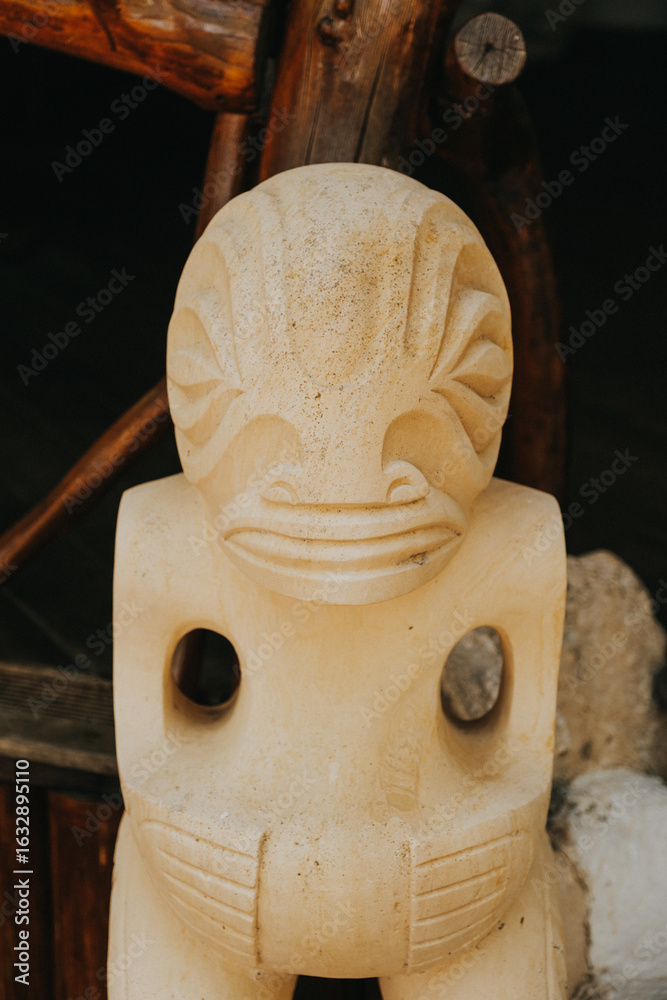 Close-up of traditional Polynesian tiki statue on Tikehau Island, Tahiti.