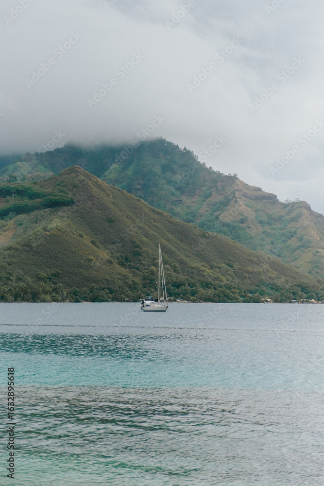 Sailboat anchored in a tranquil turquoise lagoon with lush green mountains and dramatic clouds in the background on Moorea Island, French Polynesia.