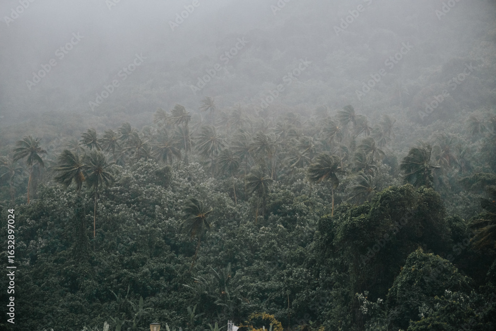 Lush tropical rainforest in morning mist on Moorea Island, French Polynesia.