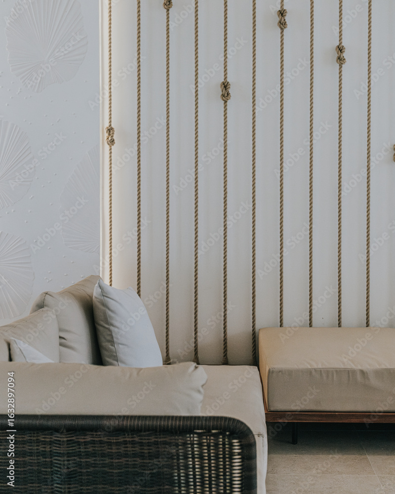 Modern tropical lounge interior with neutral tones on Moorea Island.