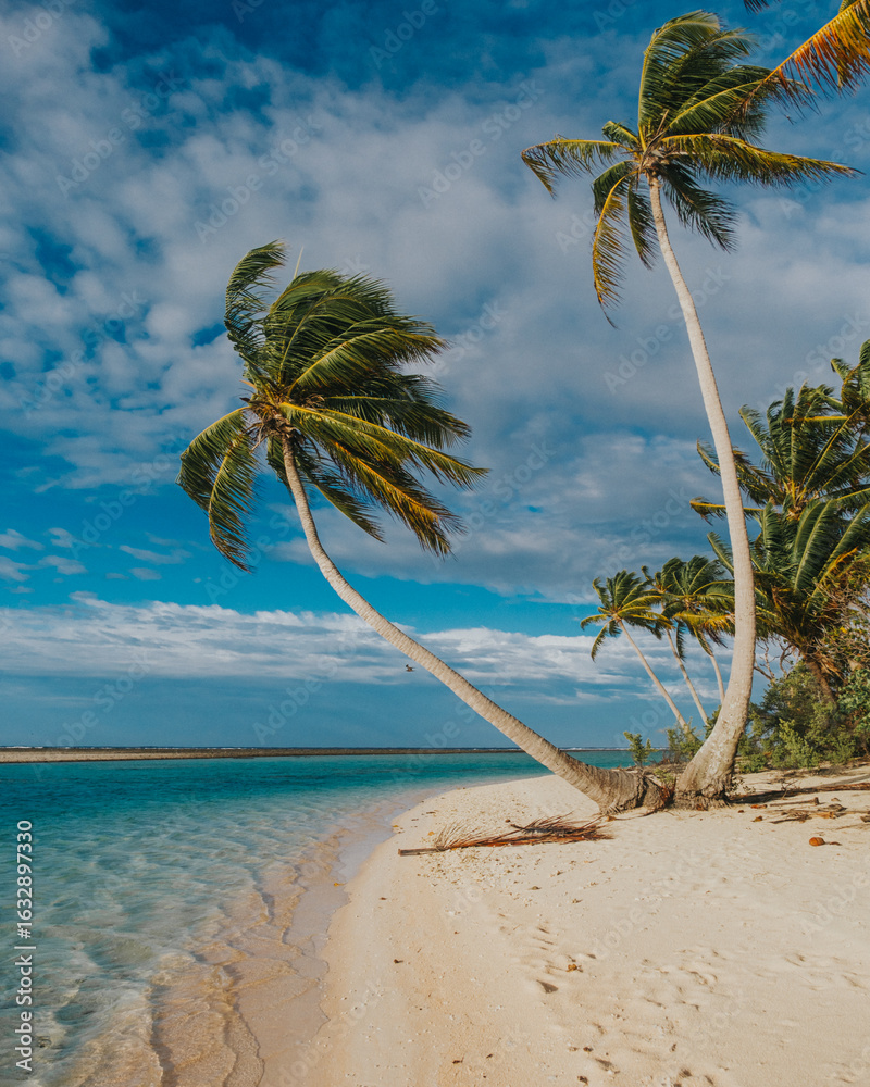 Wind-swept coconut palms on sandy beach, Tikehau Island, French Polynesia.