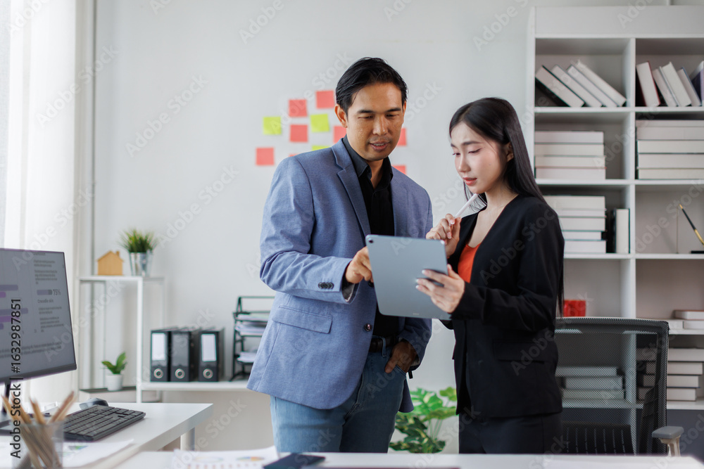 Two asian coworkers standing in the office discuss about business plan and looking at tablet.handsome asia man and beautiful asian woman as business partners working at indoor