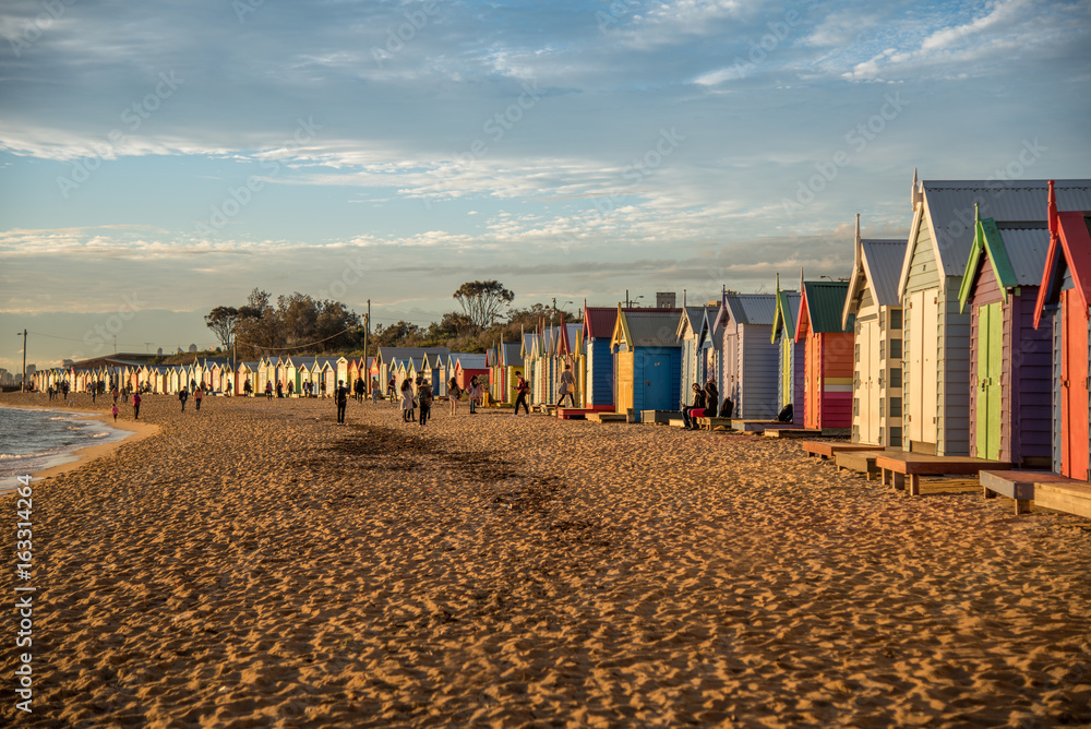 Tourists walk pass colorful bathing boxes at Brighton Beach near Melbourne, Australia.