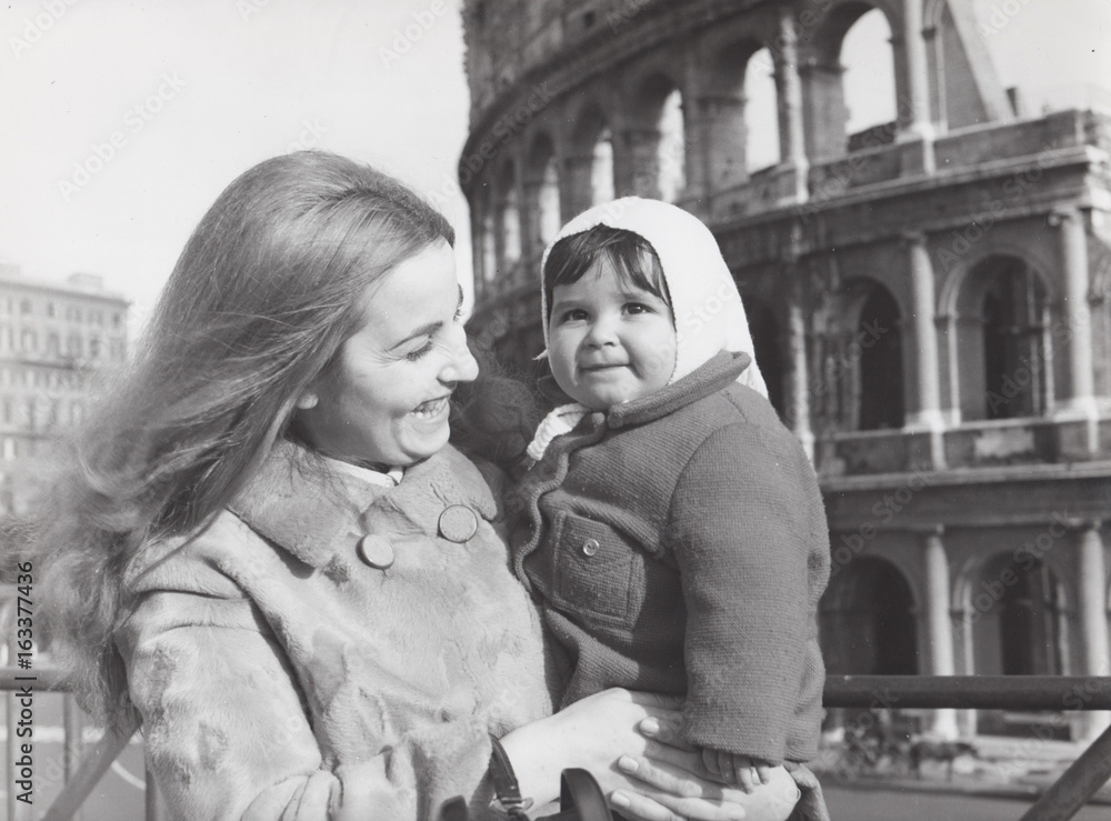 Madre con figlia piccola davanti al Colosseo negli anni settanta