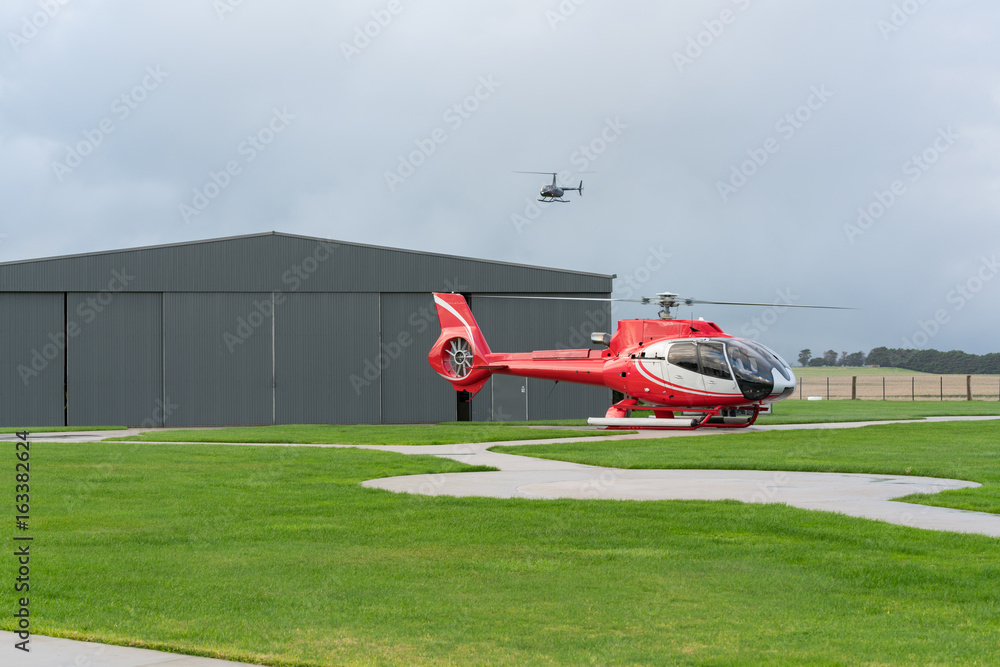 RED Helicopter landing at an Aircraft Hangar for scenic flight