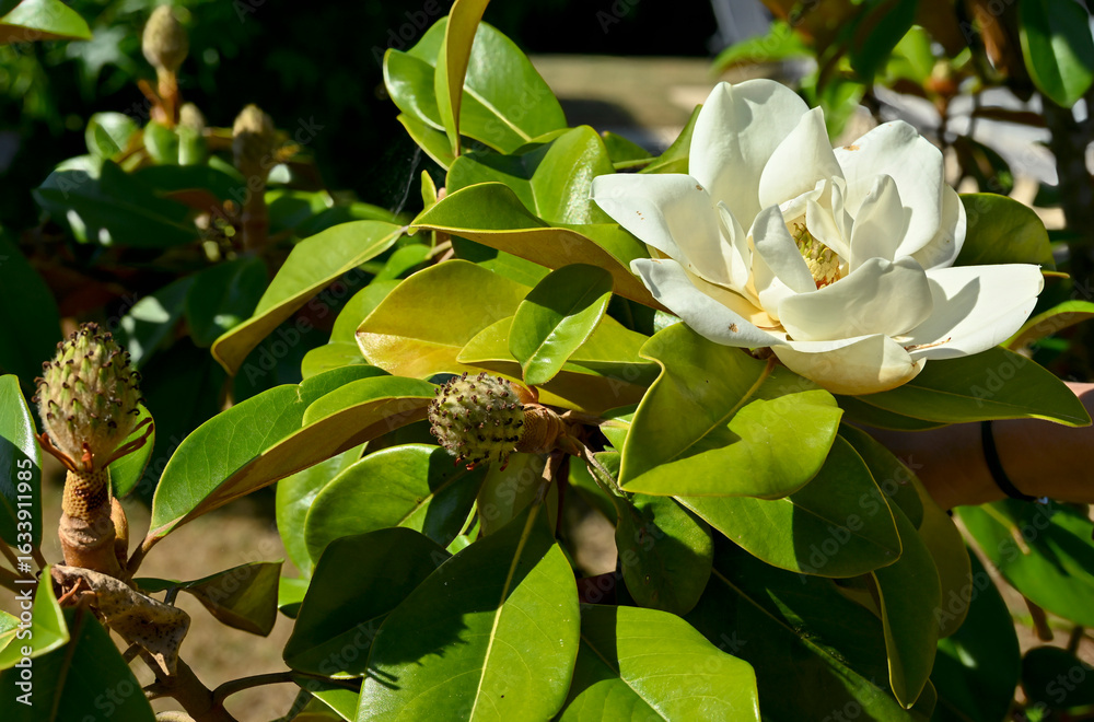 White flowers of Magnolia grandiflora, southern magnolia, bull bay