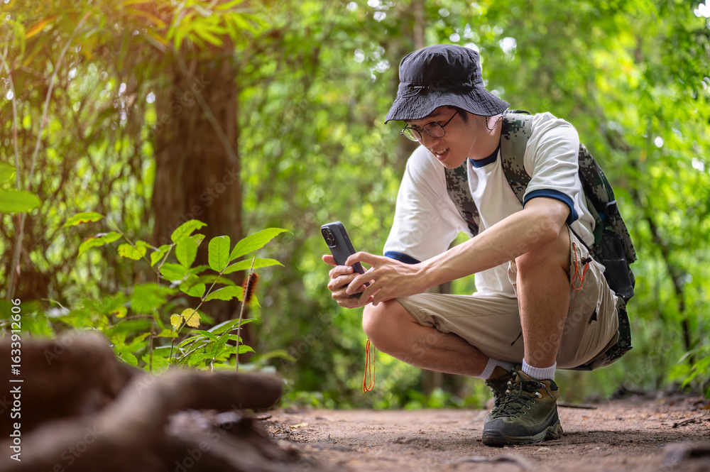 Man tourist crouching taking picture of a plant or animal on phone during forest hiking or trekking.