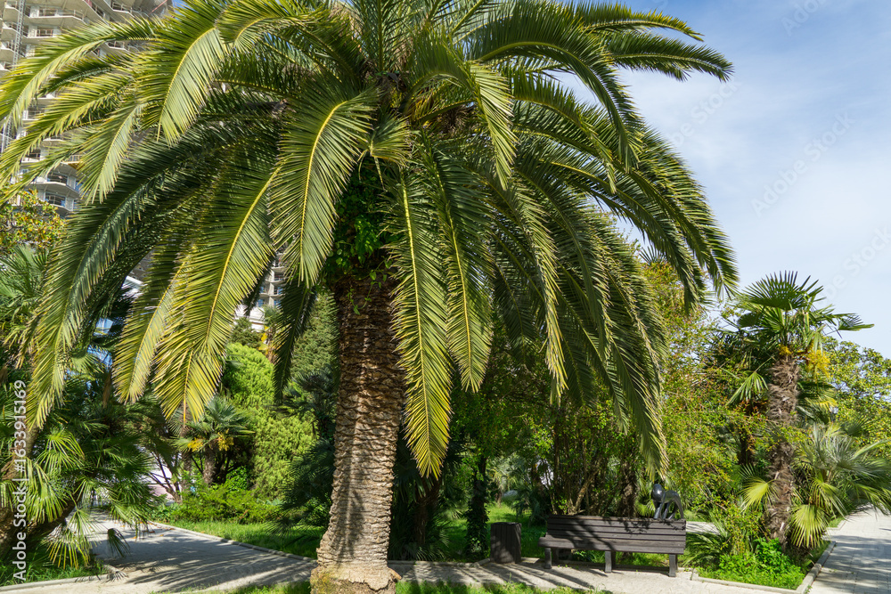 Tall palm tree Canary Island Date Palm (Phoenix canariensis) in Sochi with arching green fronds set against clear blue sky. Tree stands in lush park with various greenery and bench nearby