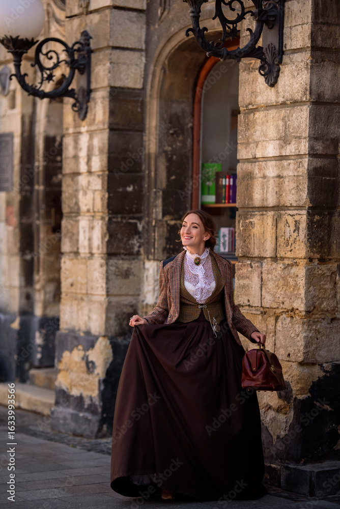 beautiful woman scientist in retro style with a briefcase on the street of the old city