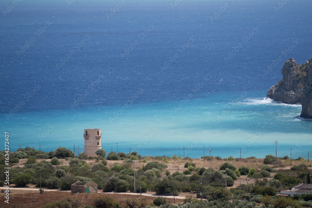 spiaggia di Guidaloca, con torre di guardia, viste dall'alto