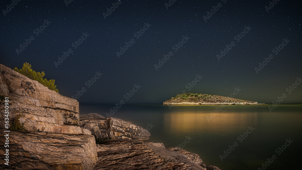 Starry night over a tranquil sea with a rocky coastline and a distant island