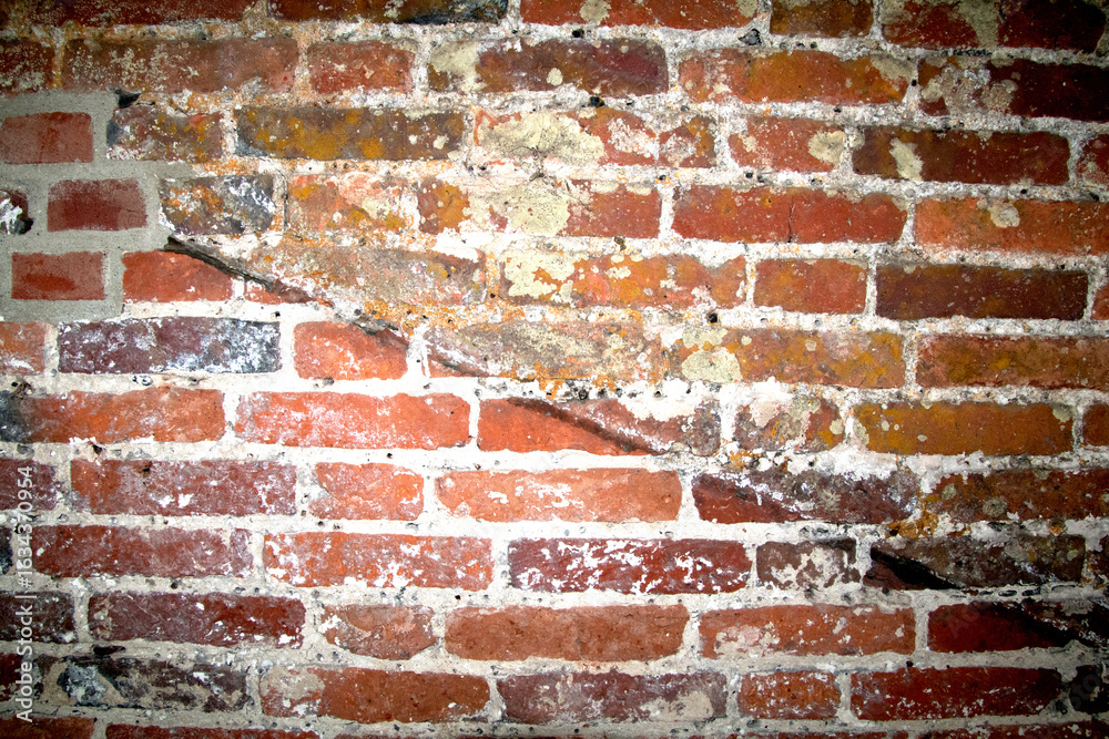 Close up of old weathered bricks outside in dark reds