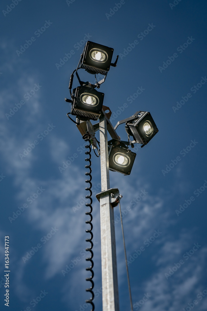 Mobile floodlight tower with multiple high power LED lamps on telescopic mast for temporary outdoor lighting at construction sites, events, and emergency work areas against blue sky
