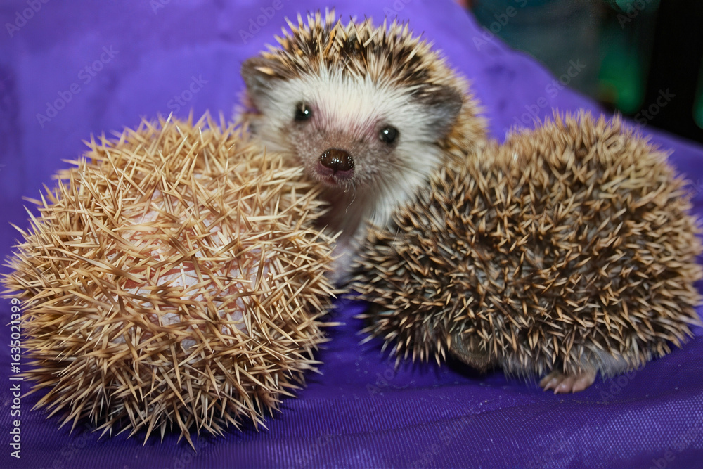 Three Hedgehogs on Purple Blanket
