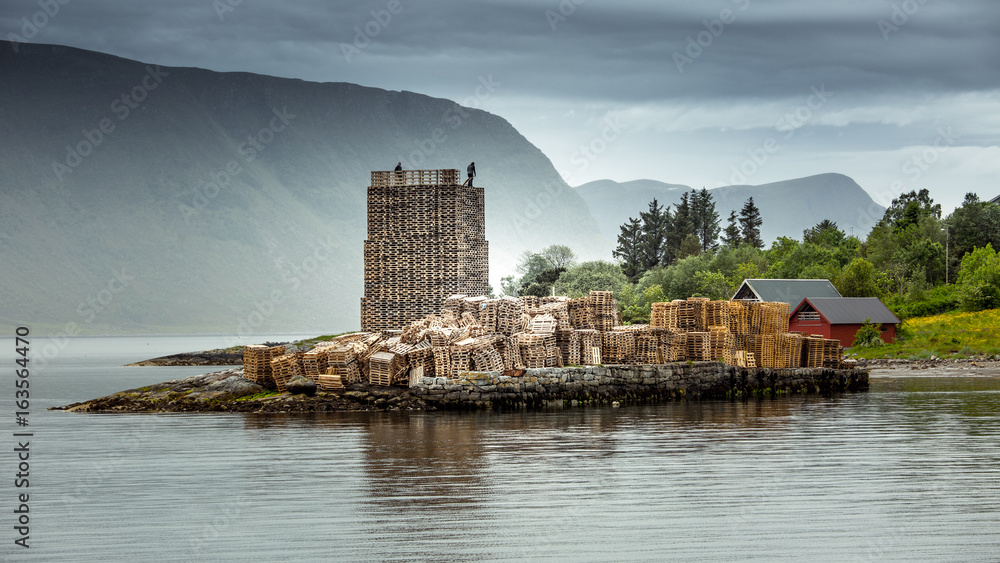 Tower of wooden pallets on the ocean. Scandinavian landscape
