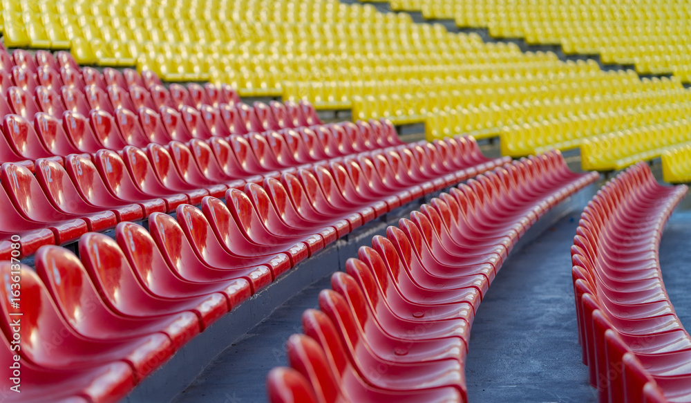 Stands of a sports arena for fans. Perspective view of amphitheater rows of stadium seats. Numbered new seats in an open sports arena. Bright sports seating illuminated by the sun, selective focus.