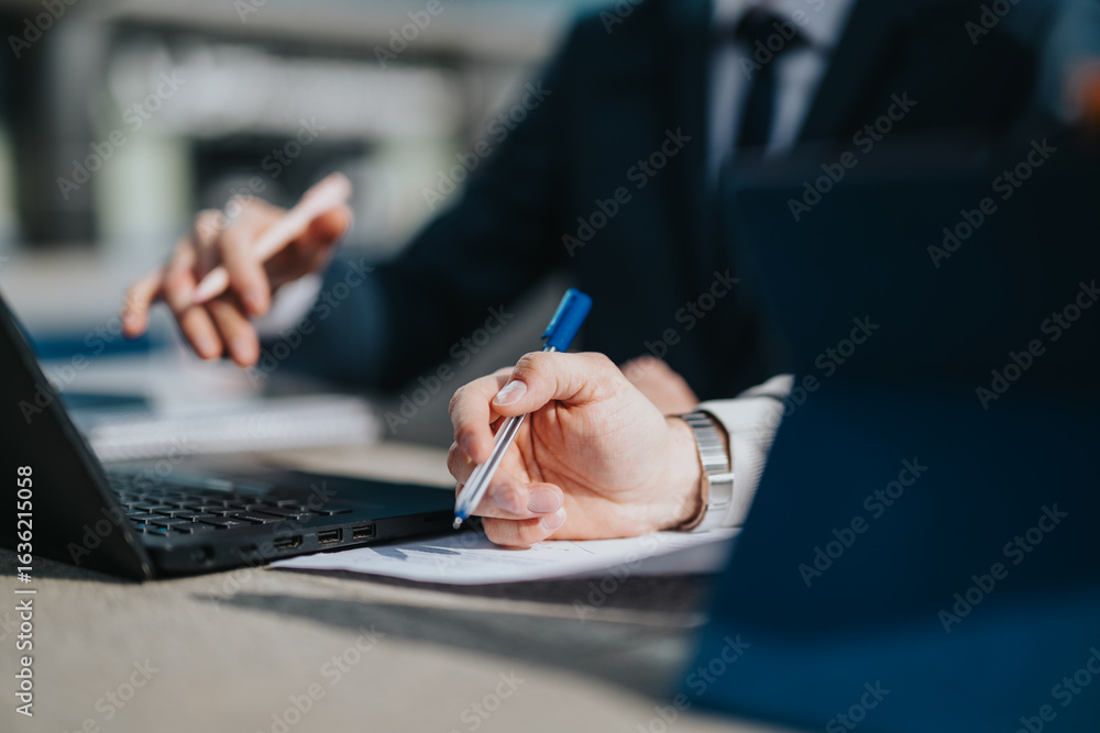 Collaborative effort in a professional setting showcasing discussions, documentation, and technology use.