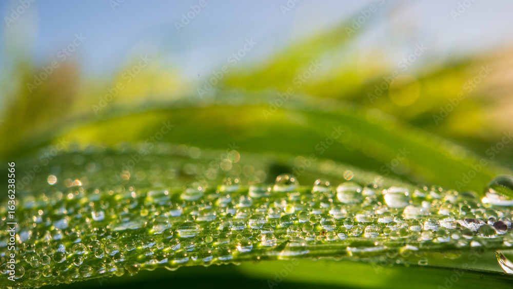 Close-up of fresh green grass with dew drops in soft morning sunlight. Natural summer background for eco, nature, or garden-themed designs