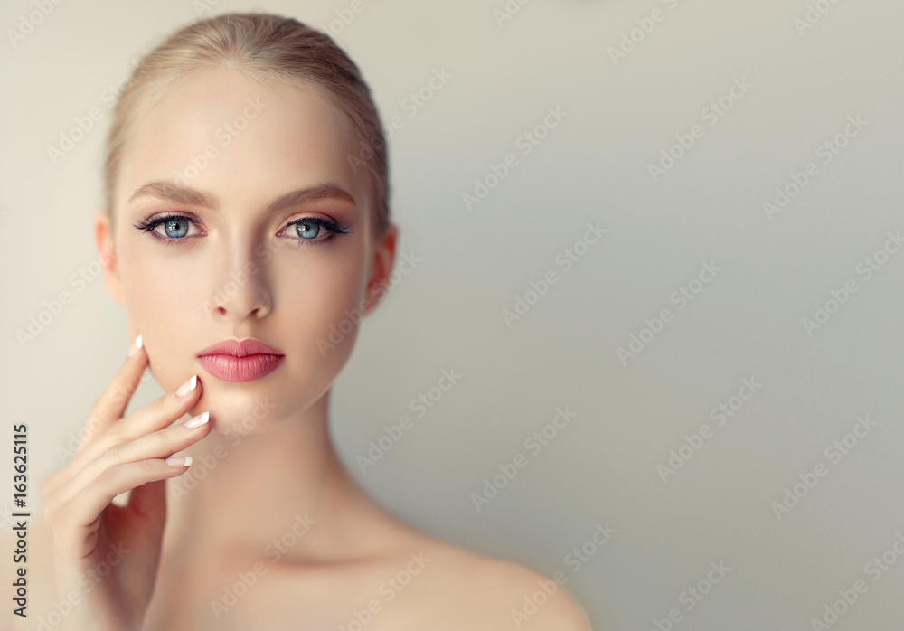 Beautiful Young Woman with Clean Fresh Skin touch own face . Facial treatment . Cosmetology , beauty and spa