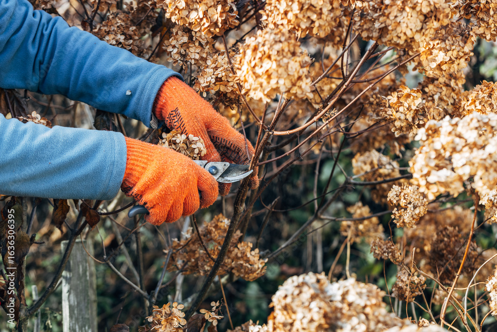 A gardener wearing gloves trims wilted hydrangea flowers before winter