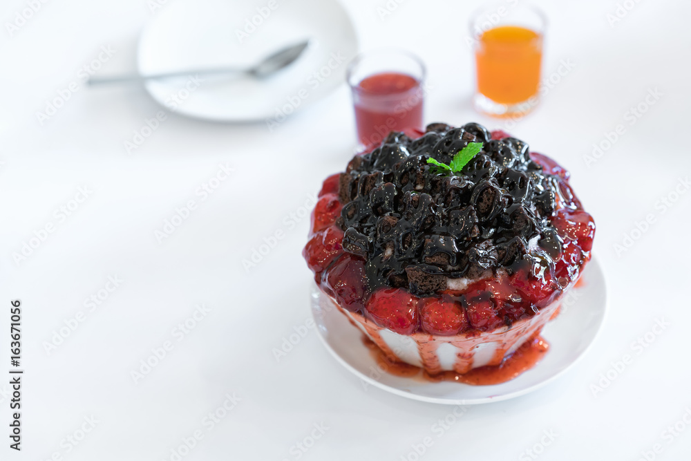 Shaved ice dessert with mixed berries on white table.