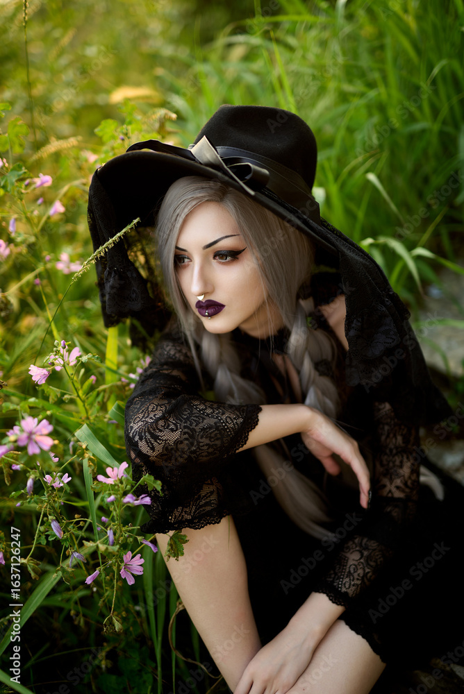 A young woman with long gray hair sits gracefully among colorful wildflowers