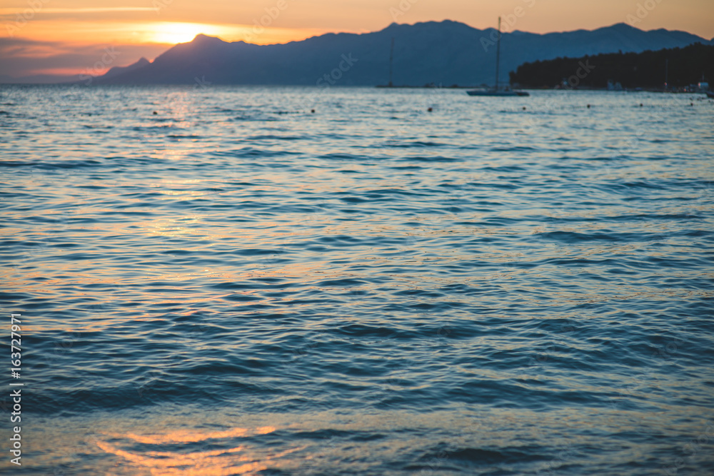 Sea waves and ripples at sunset background