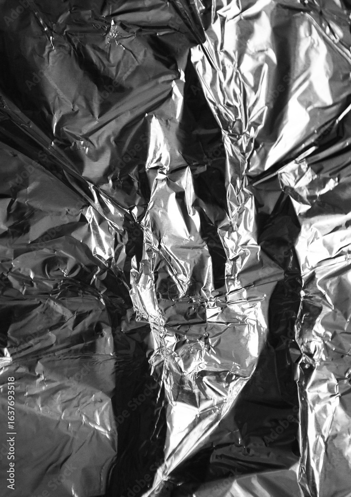 Silver foil wrinkled vector texture, realistic aluminum paper sheet, crumple metallic surface background chrome backdrop. papel aluminio arrugado.