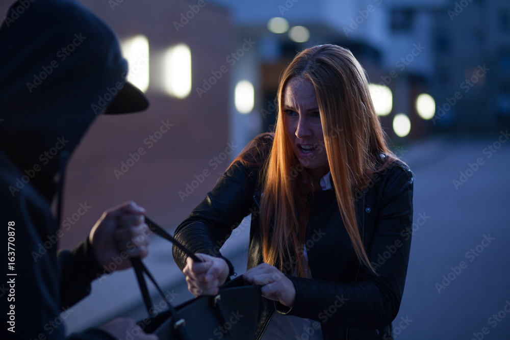 Dieb stiehlt Handtasche einer Frau in der Nacht