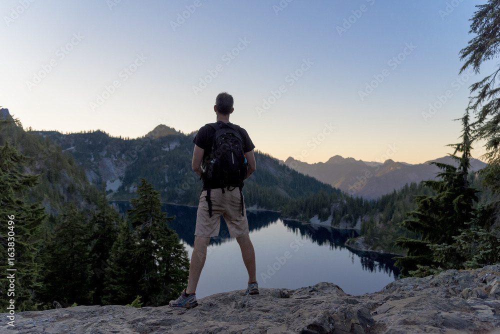 Rear view of male hiker paused to take in breathtaking view of alpine lake at sunset