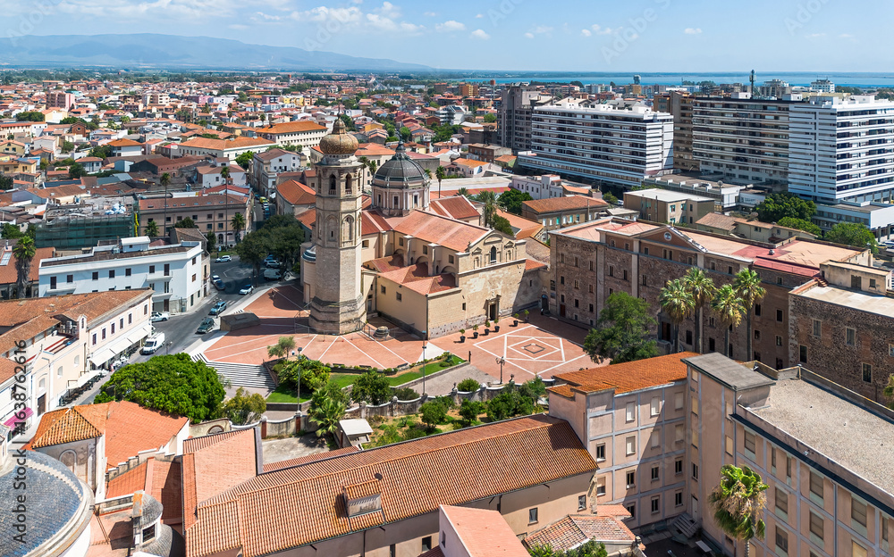 Aerial view of the Oristano Cathedral in Sardinia, Italy - Baroque cathedral dedicated to the Assumption of the Virgin Mary with a bell tower topped by an onion dome covered with maiolica