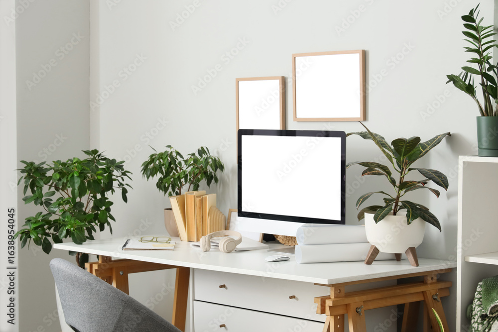 Interior of stylish home office with comfortable workspace, modern computer and houseplants