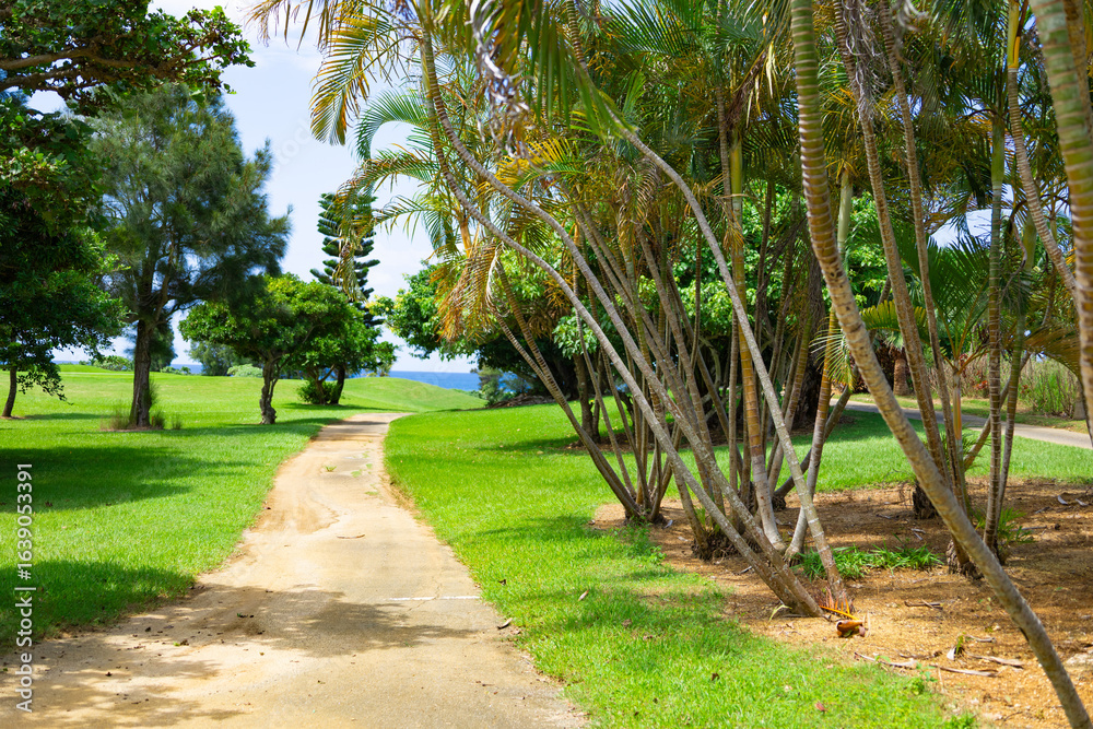 爽やかな南国の青空・公園のような鮮やかな芝が映えるリゾートのゴルフ場とヤシの木(沖縄県宮古島市)