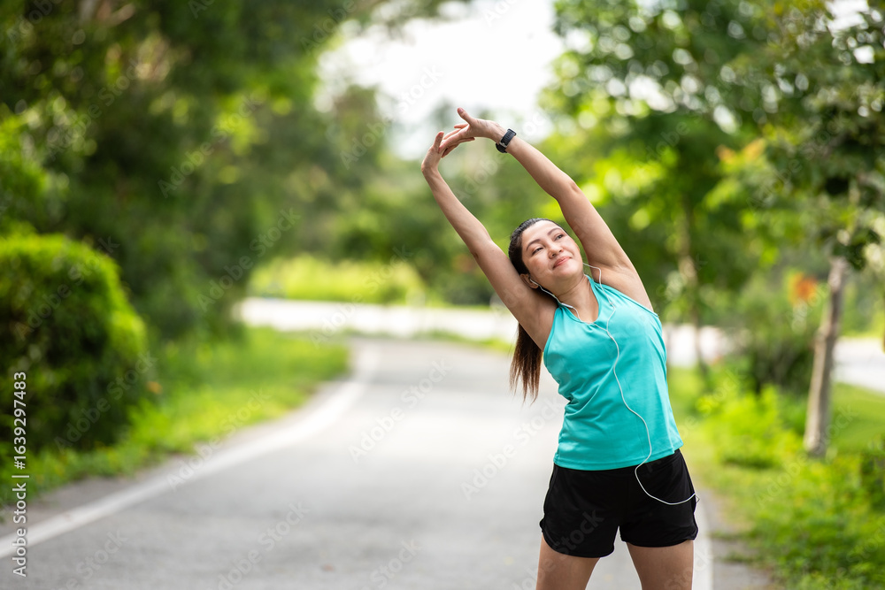Healthy woman warming up before jogging run and relax stretching her arms and looking away in the road outdoor. Asian runner people workout fitness session, nature park background