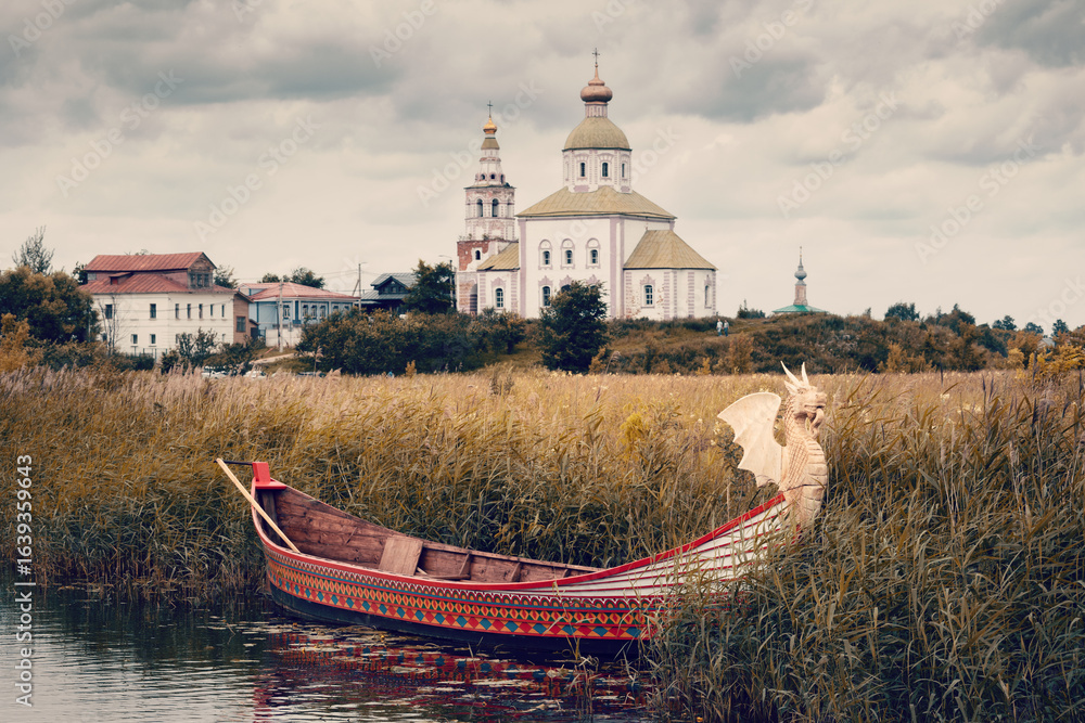 Ancient Russian church with grassy river bank and historic wooden boat on cloudy day, Suzdal, Russia