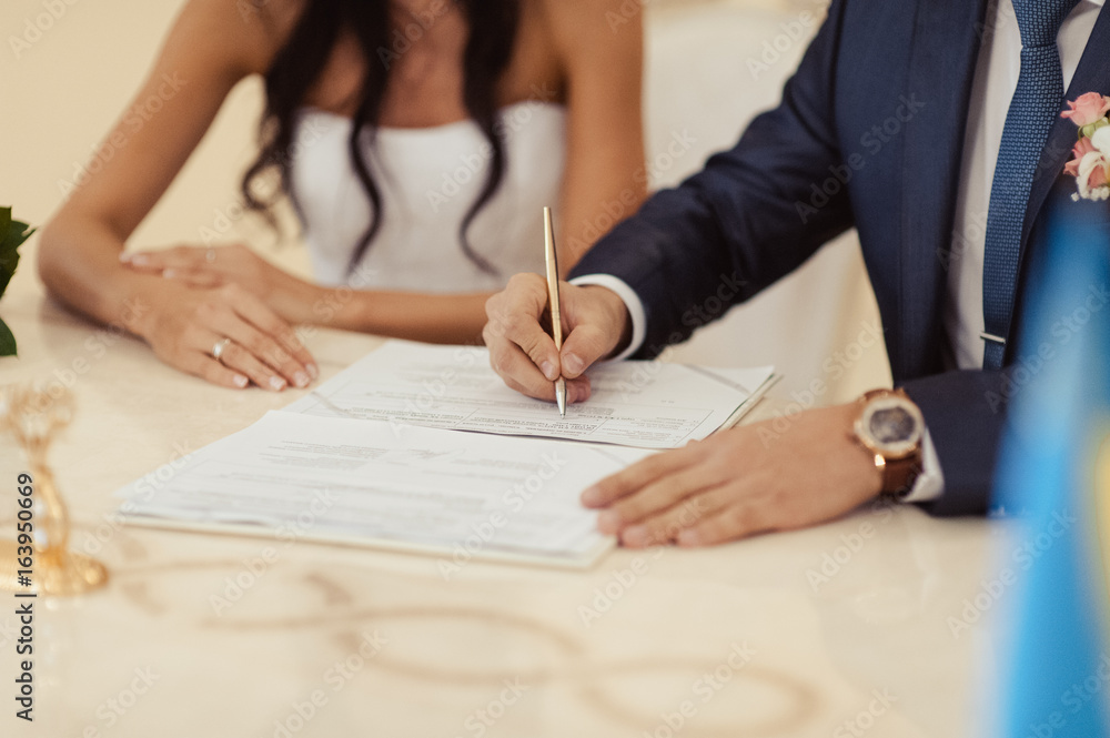 Signature Ceremony. The bride and groom sign the documents about the marriage