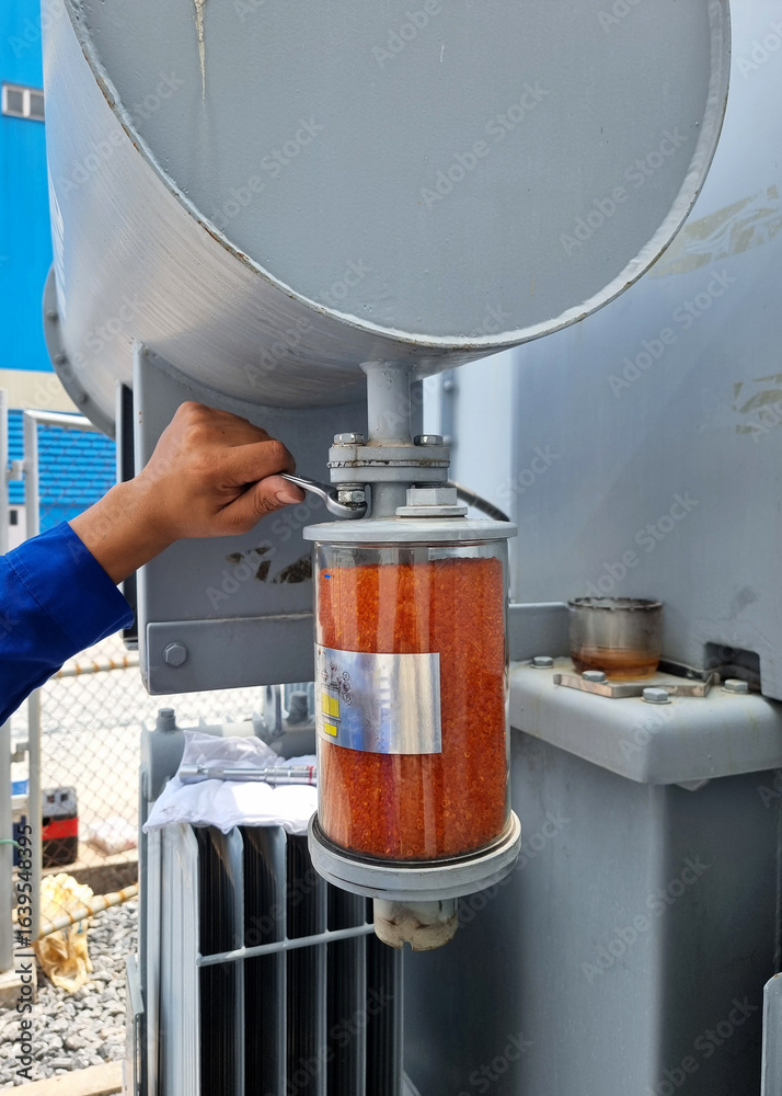 The vertical shot of transformer preventive maintenance, the orange silica gel replacement by electrician.