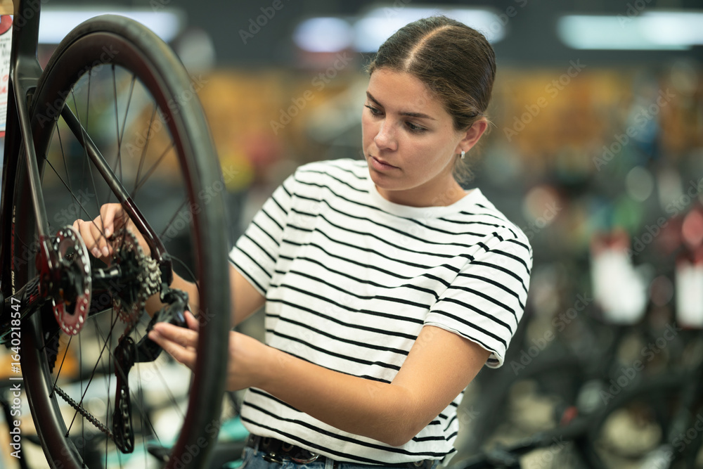 With keen attention, young female buyer examining wheel and gear mechanism of bicycle in store to ensure that parts guaranteeing cycling safety
