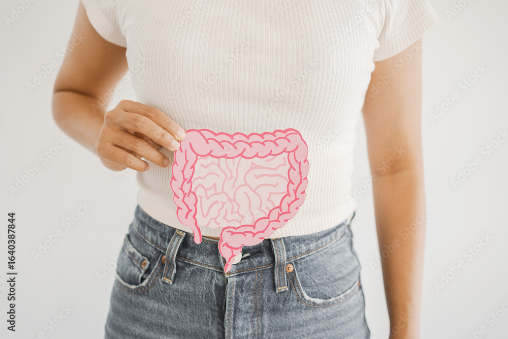 hands holding intestine shape, healthy bowel digestion, leaky gut, probiotic and prebiotic for gut health, colon, gastric, stomach cancer