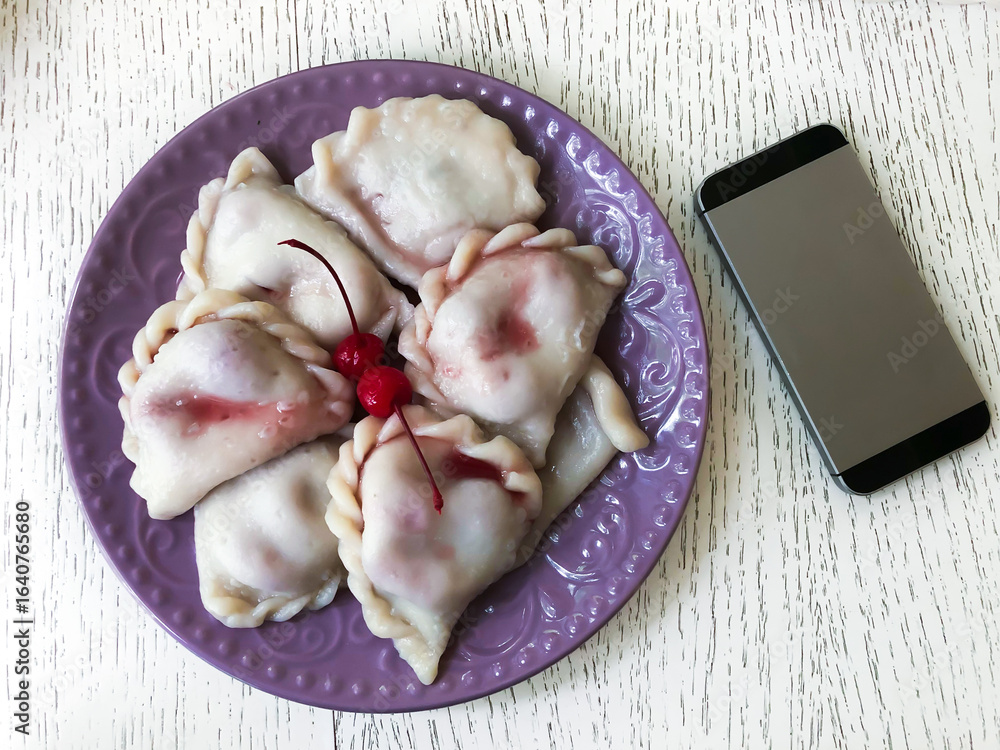 dumplings with cherries and an old telephone on the table nearby. The phone is turned off